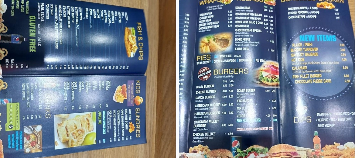 Fish & chips, other foods are always fresh and tasty. Portions are really generous. Friendly staff. The price is considerably cheaper than other shops, compared to Portion size and quality. I definitely recommend 👌