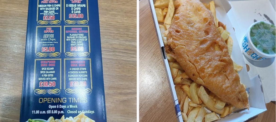 if you haven't been to this fish and chip shop you really need to go amazing value and lovely white flaky fish i cant fault it we have lived here for over 12 months and i had never been but i had a friend staying and this was the easy option but we have been back twice since. huge portions and great value 100% recommend